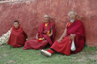 Dans le petit salon de la guesthouse, attitudes douteuses d'un lama mettant la main dans la raie des fesses de son tout jeune disciple (env. 12 ans) pour "l'aider" à se lever, sans aucune réaction du jeune homme qui semble habitué. Cette attitude sans équivoque nous choque. Les autres lamas sont assis dans l'herbe, fiers devant leur belle voiture, oisifs toute la journée. Il nous reste le Tibet à traverser avant de nous faire une opinion plus précise. Nous irons voir au printemps prochain.