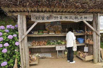 Le concept intéressant des cultivateurs de la région est de mettre en sac leurs légumes pour une valeur de 100 yens chacun. Une petite boîte à l’entrée de l’échoppe pour y mettre vos yens équivalents à vos achats. Pas de contrôle, et le matin le paysan remet des légumes frais et prend ses sous.