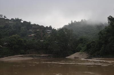 Dans la végétation tropicale des berges à tribord, apparaissent quelques rares villages laos et à babord, de plus rares villages birmands. Le Mékong sert de frontière aux deux pays.